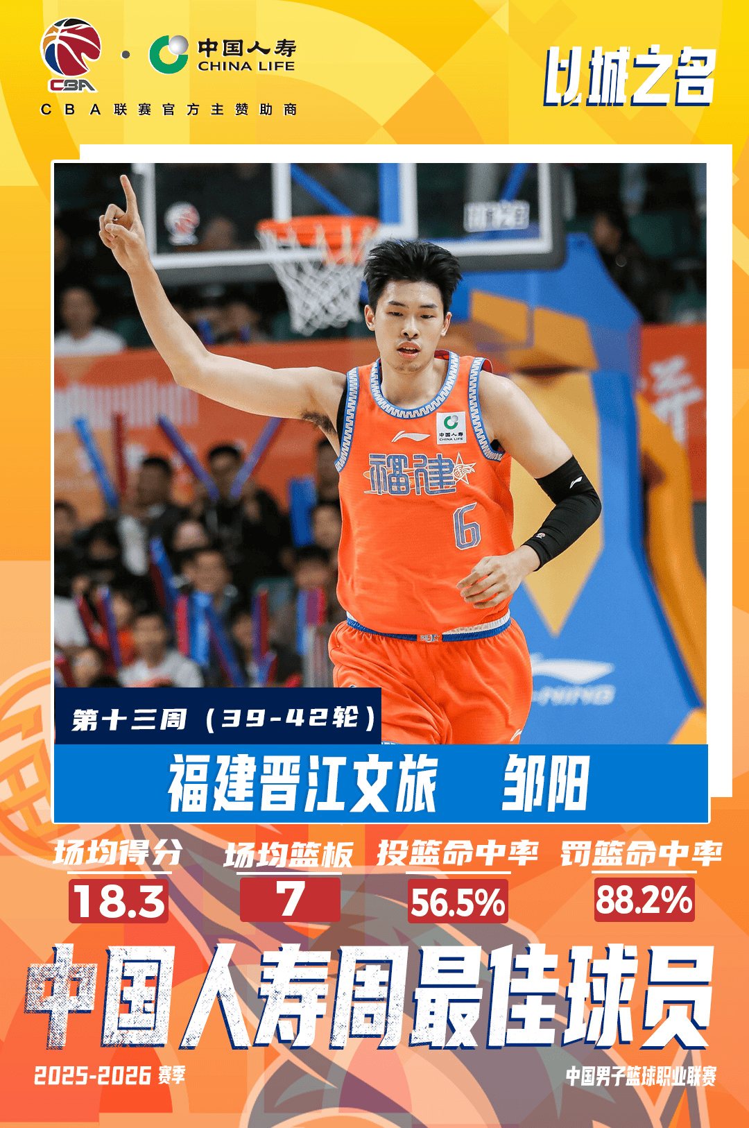[流言板]官方:福建球员邹阳当选本赛季常规赛第十三周周最佳球员